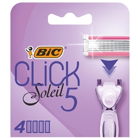 This pack contains four razor blade refills for the BIC Click 5 Soleil razor for women. The razor blade refills come in a 100% recyclable packaging made from 80% recycled material and are designed to provide a smooth and even shave.
