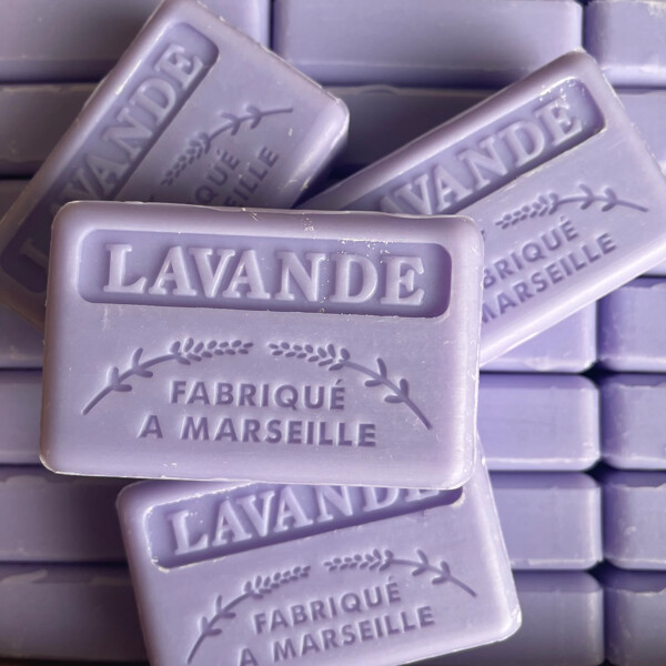 Sodium palmate, sodium palm kernelate, aqua, parfum (huile essentielle de lavandin), butyrospermum parkii, glycerin, sodium chloride, tetrasodium EDTA, tetrasodium editronate, geraniol, limonene, linalool, CI 74160, CI77007