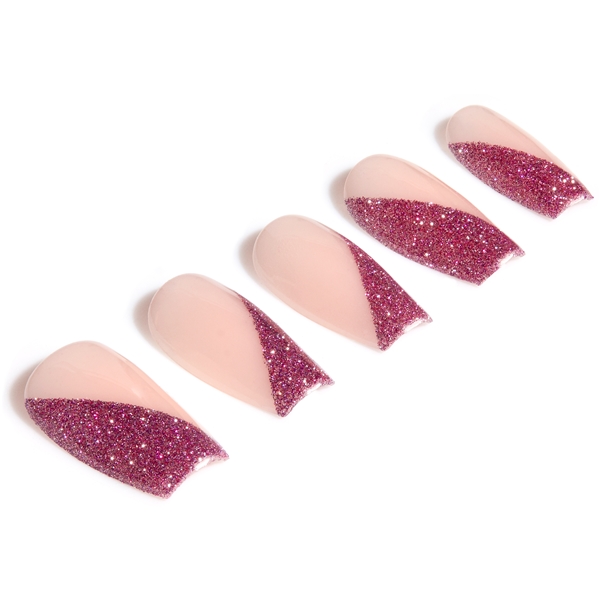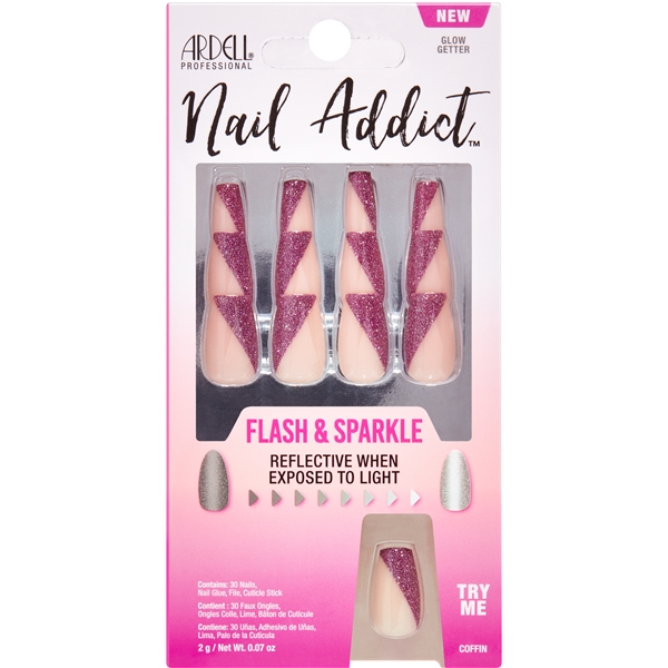 Sparkling salon-quality nails in an instant. Ardell's Nail Addict Flash & Sparkle press-on nails have an iridescent shimmer effect. An innovative reflective glitter technique makes the nails shine and sparkle in different types of light. The effect is activated by camera flash, LED/UV, and disco lights. Let your nails shine!