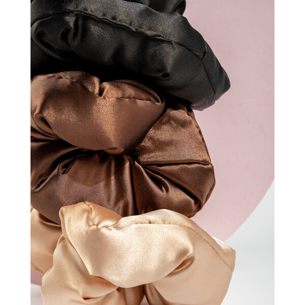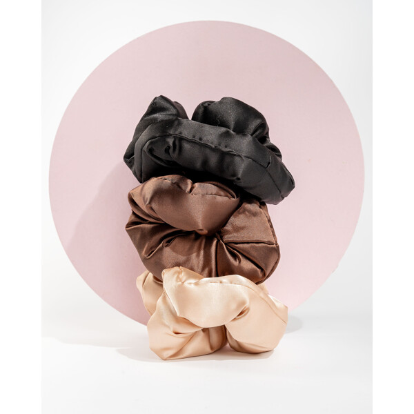 Upgrade your hair care routine with Brushworks Large Classic Cloud Scrunchies. With a softly padded filling covered in luxurious satin, they are as soft as a cloud and keep your hair in place without pulling or tugging.This 3-pack in neutral colours combines style and function – perfect for any occasion. Whether you're relaxing at home, on the go during the day, or getting ready for the evening, these versatile scrunchies follow along effortlessly. The padded design also provides extra comfort, even overnight, and helps prevent creases and bends in the hair.
