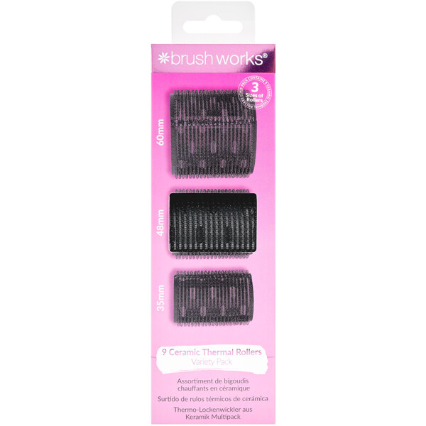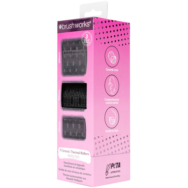 Create full, salon-beautiful curls at home with Brushworks heated rollers. The set includes nine rollers in small, medium, and large sizes, perfect for different curl sizes.The ceramic core retains heat evenly and gives the curls long-lasting hold, volume, and bounce – without frizz. The result is smooth, shiny, and professional every time.Easy to use and gentle on the hair, for large, long-lasting curls in no time.PETA-approved – cruelty-free and vegan.
