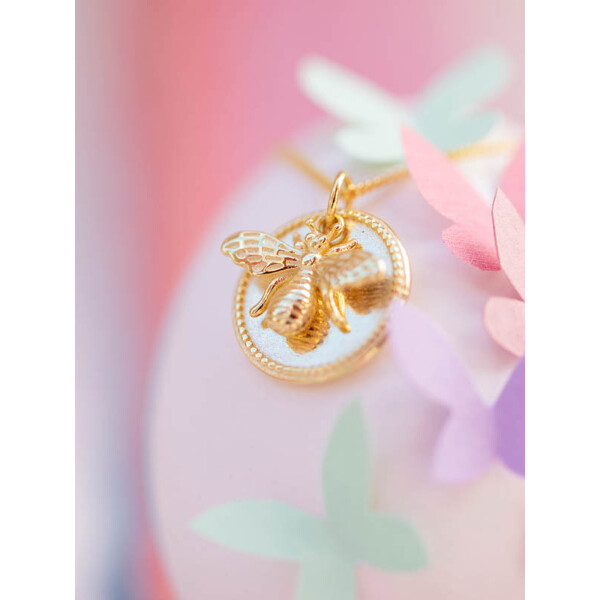 18K gold-plated 925 silver necklace. The pendant consists of a flat charm and a cast detailed bee hanging in front.